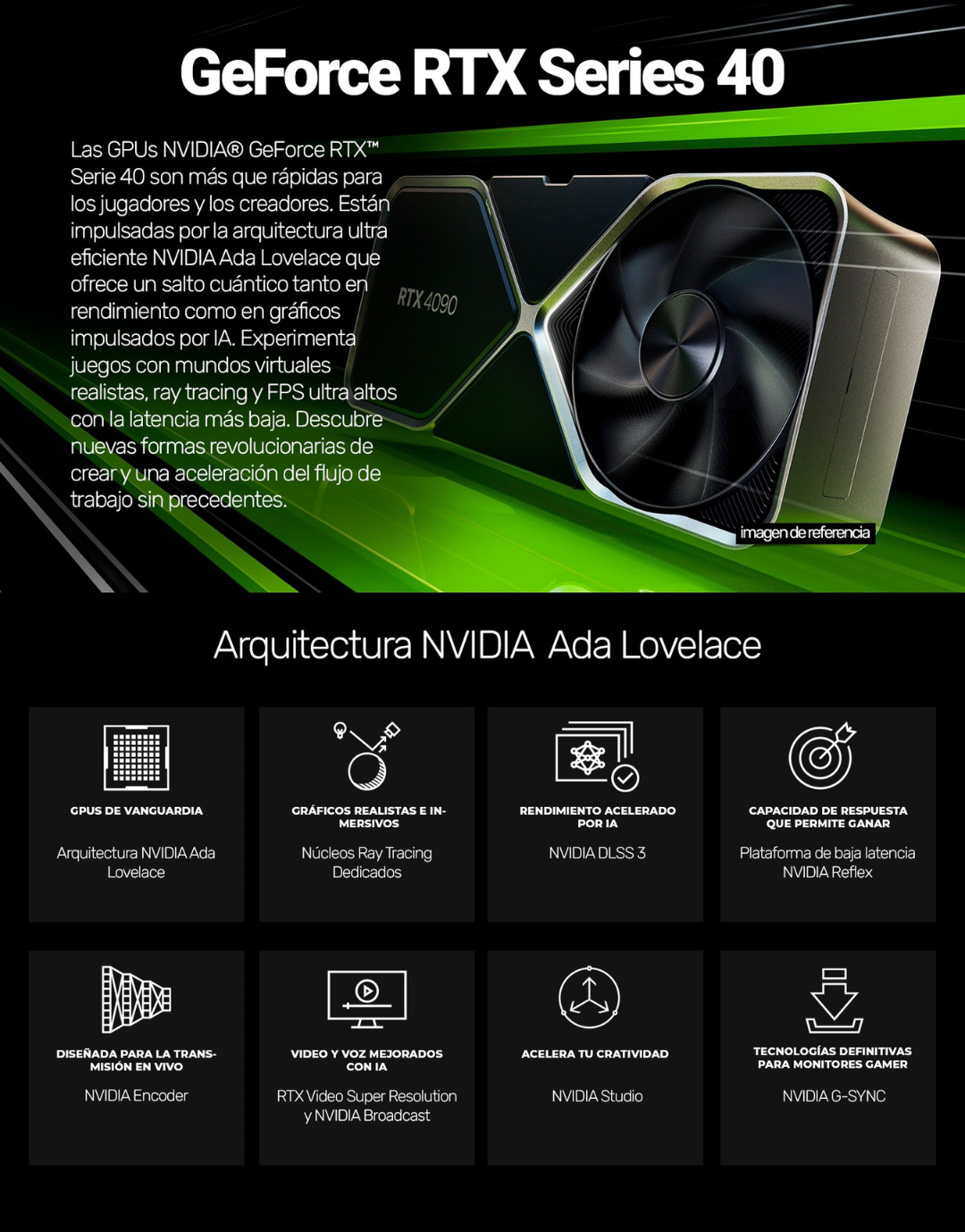 - Tarjeta Gráfica NVIDIA RTX 4060 Ti 16GB (opción de upgrade a RTX 4070 SUPER 12GB): potencia gráfica de nueva generación con ray tracing y DLSS 3.5.