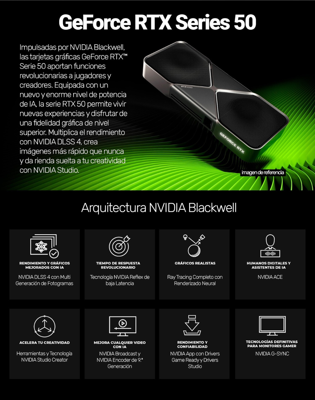 - Tarjeta Gráfica NVIDIA RTX 5070 Ti 16GB (opción de upgrade a RTX 5080 16GB GDDR7): potencia de nueva generación con soporte para Ray Tracing y DLSS 3.5.