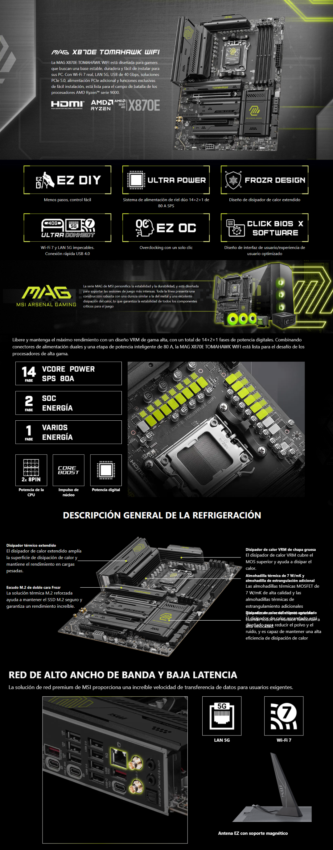 La MSI MAG X870E TOMAHAWK WIFI está diseñada para entusiastas y gamers exigentes que buscan lo último en conectividad, estabilidad y rendimiento extremo. Con soporte para AMD Ryzen™ series 9000, 8000 y 7000, memoria DDR5 hasta 8400+ MT/s y almacenamiento PCIe 5.0, esta placa base está lista para el presente y el futuro del alto rendimiento. Su robusto diseño térmico y conectividad Wi-Fi 7 + LAN 5G la convierten en una de las opciones más completas del ecosistema AM5.