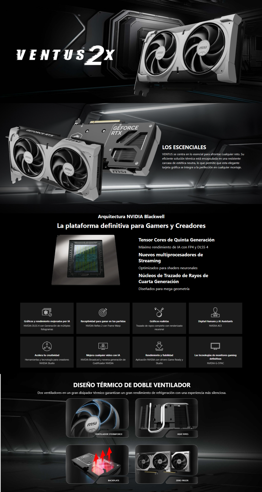 La GeForce RTX™ 5060 Ti 16G VENTUS 2X OC PLUS es una tarjeta gráfica ideal para gamers exigentes y creadores que buscan alto rendimiento, eficiencia energética y compatibilidad con las últimas tecnologías de NVIDIA. Gracias a su arquitectura RTX y memoria GDDR7, permite jugar en 1440p y 4K con gran fluidez y estabilidad.